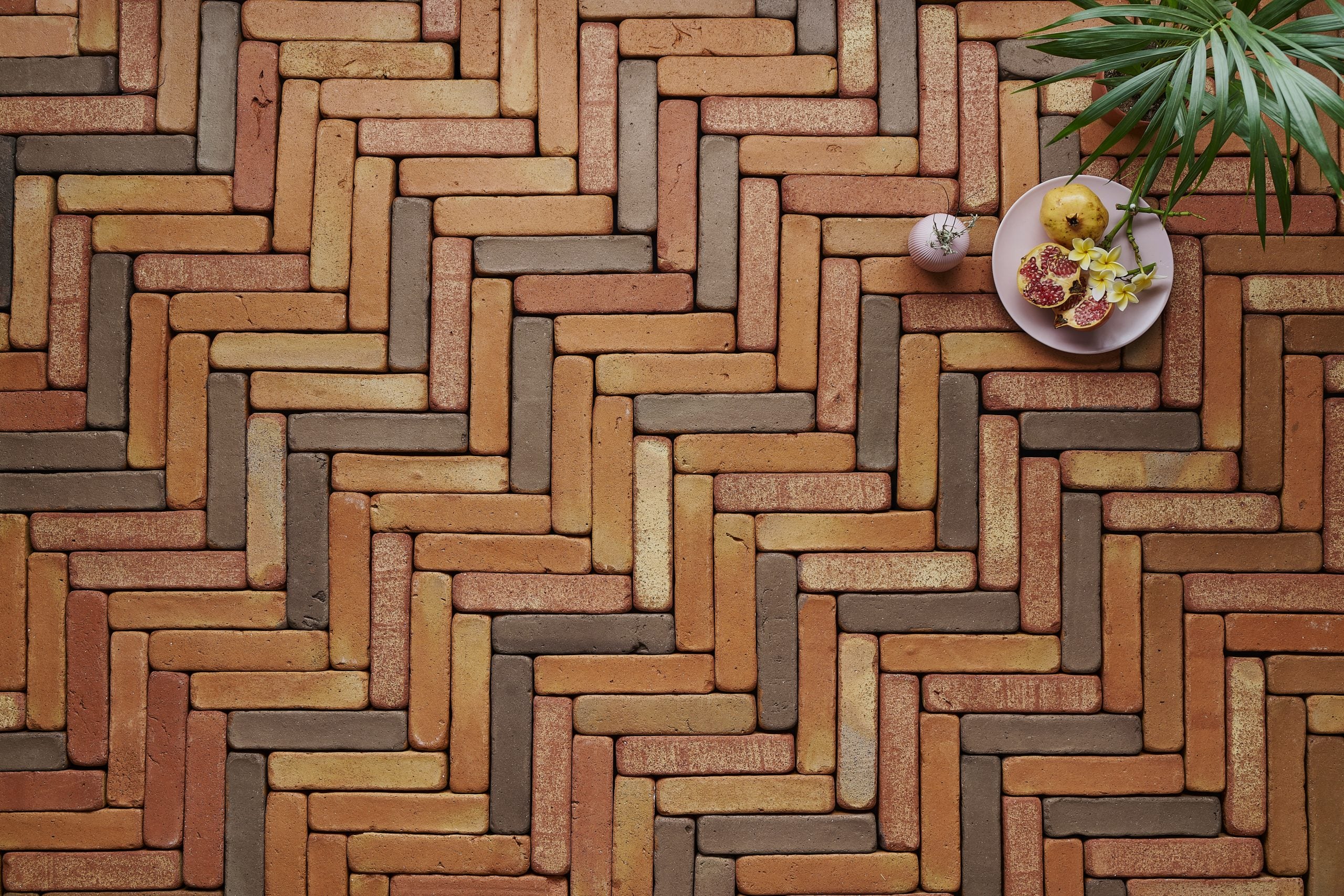 La mezcla selectiva y muy destonificada de nuestras tonalidades rojiza, salmón y pizarra da como resultado el conjunto Baraca: una tonalidad única para suelos de barro.