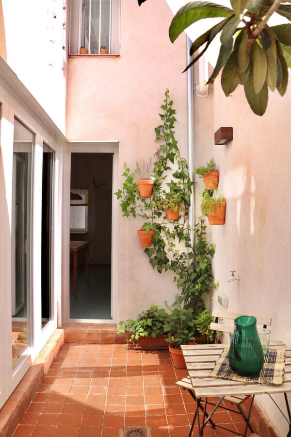 As Marcos said, the project uses our Cuadrado 15 reddish clay tile on the floor of a small living room and in the adjoining garden. The 15 cm square tile is what we call a classic among classics. This is by far the most versatile size of the whole range.