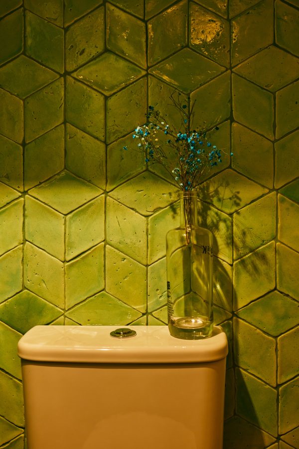 For the bathroom, they used two of our glazed tiles: the Brisa color, in the Rectángulo 20×10 format, and the Arrecife color in the Rombo iso 10 format. The natural variations in tone of our glazed colors give these walls a chromatic richness that mimics the diversity of nature (hence their names), making the spaces interesting and varied, without sacrificing visual coherence and respecting the aesthetic identity of each project.