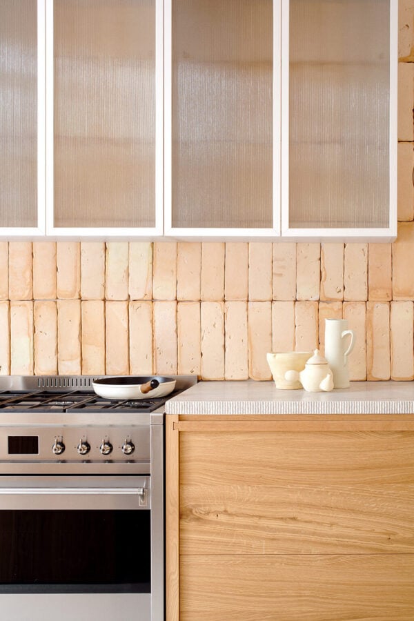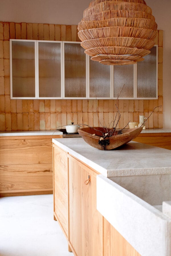 The straw Rectángulo 30×10, used as the main cladding, adds a touch of elegance and sophistication to the kitchen. Its geometric design and warm tone blend perfectly with the other elements of the Still model, highlighting the beauty of the wood, stone, and clay present in the space.