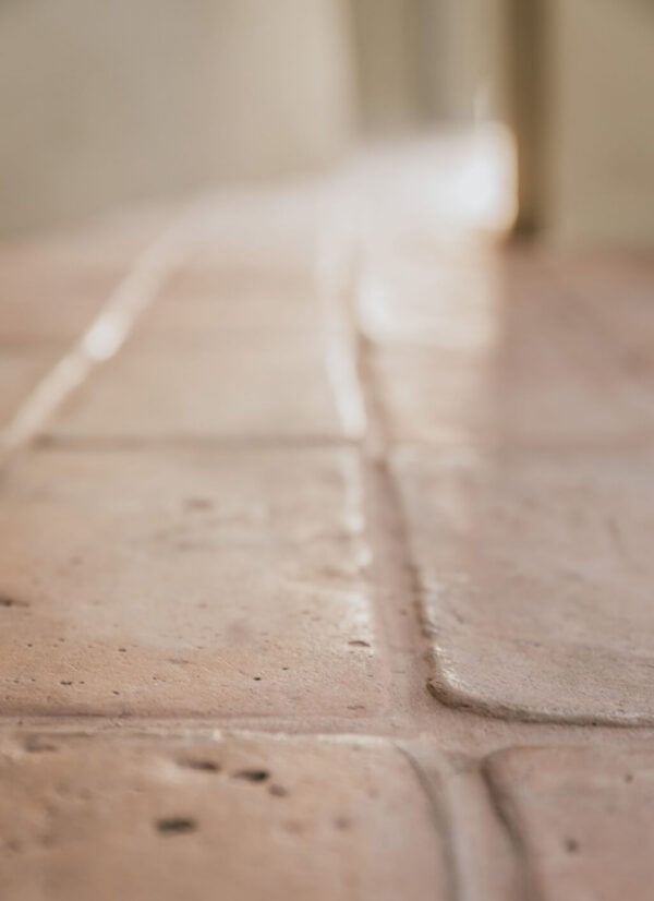 A floor and wainscoting of terracotta bricks for Doble Uve, an artisan bakery in Madrid