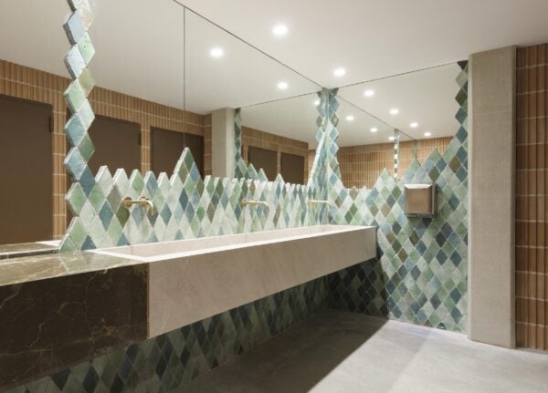 We are right on the Mediterranean, therefore marine shades were one of the essential elements in this venue. C’an Pantina chose for the wall of one of the bathrooms the glazed Rombo ISO 10 tiles, a shaded combination of aquamarine hues that reminds us of the marine essence of this Balearic Island. For the second bathroom they chose the Cuadrado 10, our smallest chequerboard tile, combining shades of red, salmon, flamed straw and antique white for the wall.