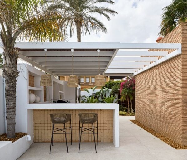This project is a perfect example of the versatility of terracotta tiles. The studio has used the same checkerboard for the interior and exterior, and the pieces work in both environments. The exterior of the house has several zones. It has an area around the pool, a chill out area, a barbecue area… and we found our pieces spread over several areas. In the barbecue area, we found them at the bar and at the bottom of the shelves that cover the kitchen. In the pool area, a painting is the protagonist of the wall that runs lengthwise, enclosed by a frame in relief.