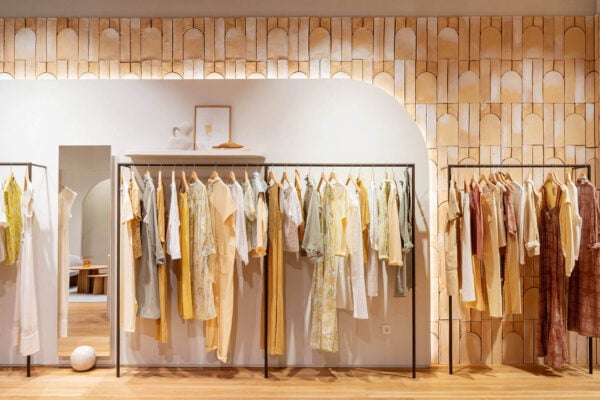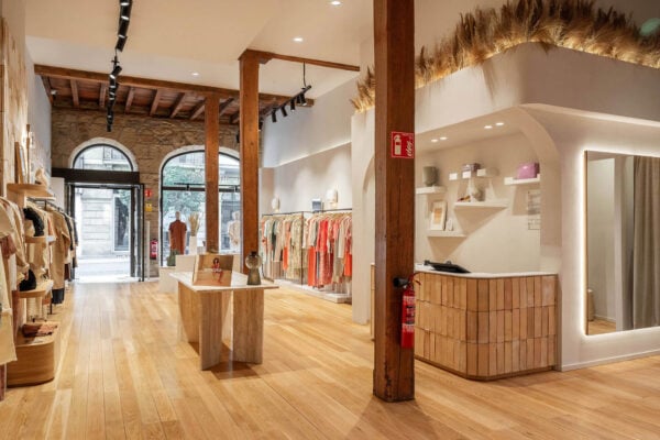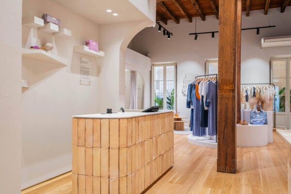 For the redesign of the original and main store of this sustainable women’s clothing brand, the Avandmo studio has relied on two of our fired clay brick formats. One of them, the simple Rectángulo 30×10 in Straw color, has gone to clad the counter of the store. The other, our combined format Vélez-Acueducto, has found its place in the world by covering an entire white brick wall.