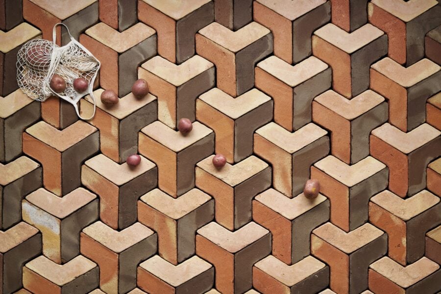 An original combination of terracotta tiles which is reminiscent of the enticing figures formed by a kaleidoscope. The organic appearance serves to accentuate and highlight the color variations of the pieces in a particularly attractive way.