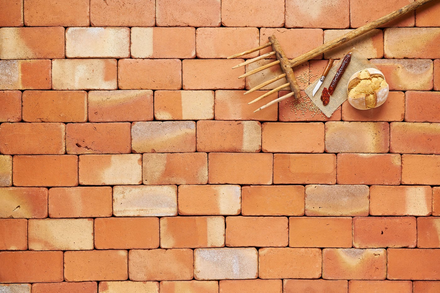 A floor and wainscoting of terracotta bricks for Doble Uve, an artisan bakery in Madrid