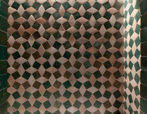 Por un lado, se instaló un fondo de cocina con rombos esmaltados en blanco mate que intensifican el contraste con el toque rústico del ladrillo rojizo en textura Antique del suelo. Por otro lado, eligieron una de nuestras composiciones estrella para el revestimiento del baño: nuestro formato combinado Prometheus 10 de piezas esmaltadas formado por rombos blancos muy destonificados y cuadros verde Zamarut en mate.