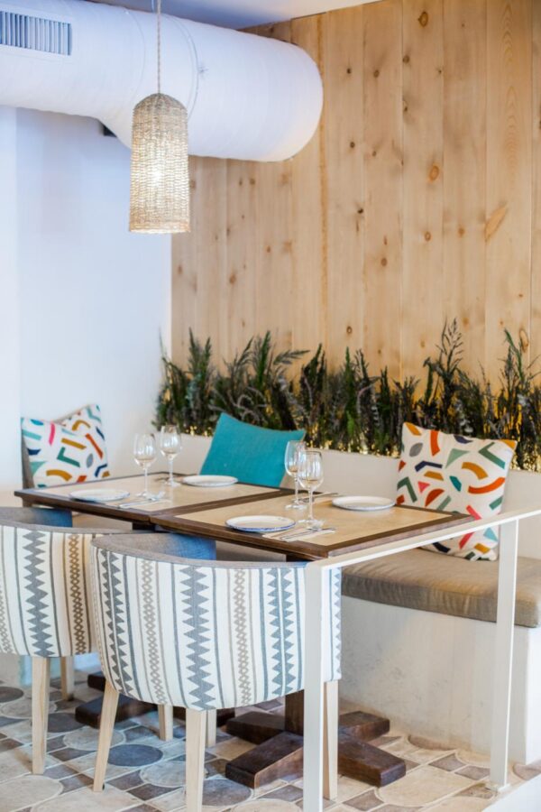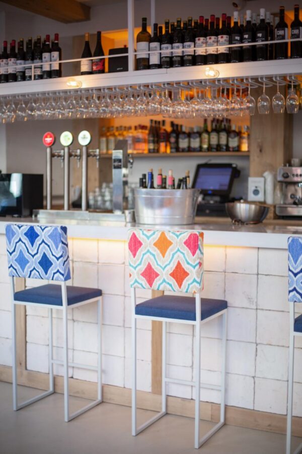Para el suelo elevado y las escaleras se decantaron por nuestra Colección Vélez-Ondas, una de las más versátiles de nuestro catálogo. Esta colección, diseñada por LEBLUME, está compuesta por piezas de barro que exploran las líneas curvas y permiten crear teselaciones perfectas para espacios amplios creando un ritmo poco habitual en suelos de barro pero efectivo y con mucha personalidad. Para la barra, por otra parte, optaron por uno de nuestros formatos estrella: el Cuadrado 20 en tonalidad Blanco Antiguo, que proporciona frescura y tradición al ambiente.