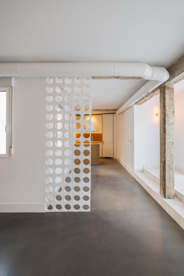 Con 70m de superficie en un espacio estrecho y alargado, Lavedan consigue actualizar la distribución de la estancia, convirtiendo el lugar en una acogedora pero minimalista vivienda para uno en la que el blanco, la luz y la amplitud que proporciona la terraza son protagonistas.