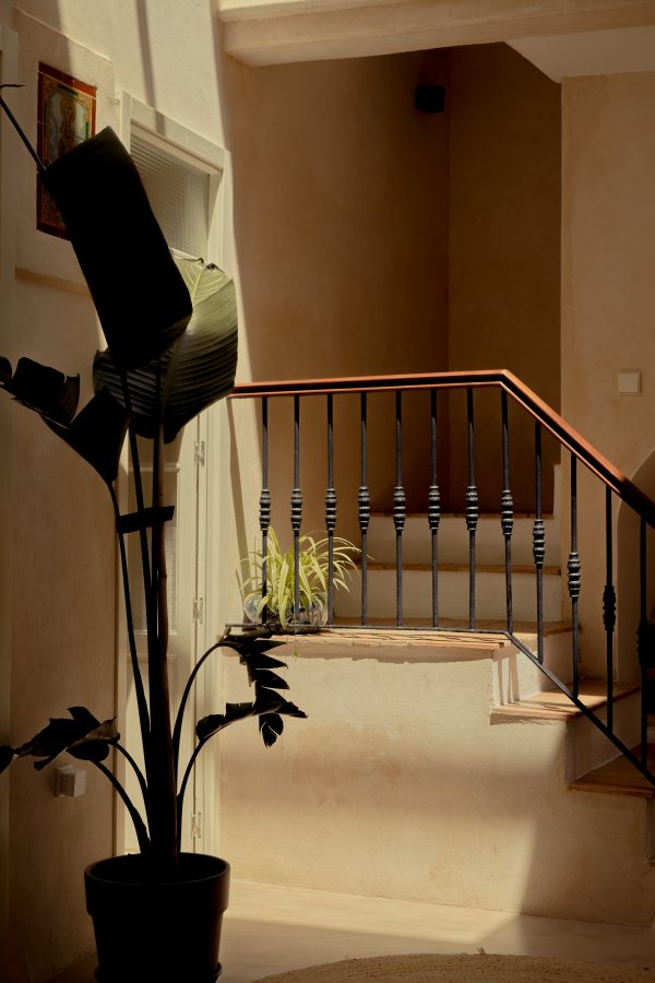 La paleta de colores respeta perfectamente la del exterior de la vivienda, manteniéndose dentro de los tonos claros, cálidos y terrosos que cubren las calles de la ciudad. Para ello, N J Studio ha hecho uso de materiales tradicionales de la arquitectura vernácula de Vejer: mortero de cal, fibras naturales y ladrillos cerámicos para el suelo y las escaleras.