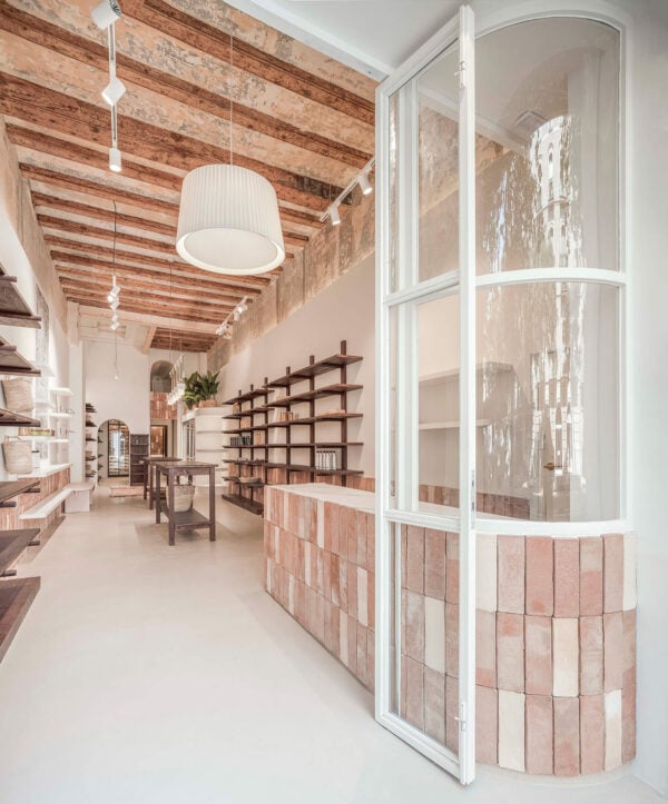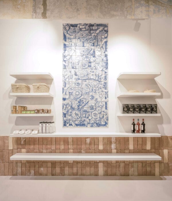Los muros de piedra y las vigas de madera antiguas se han conservado para preservar la autenticidad y añadir un toque de historia al espacio. Además, la iluminación adecuada realza la exposición de los productos, al tiempo que resalta la estética original del lugar.