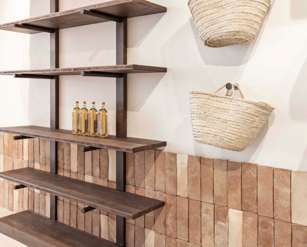 Desde el momento en que uno accede a La Cofradía, se siente invitado a explorar y descubrir. El acceso con un gesto curvo y orgánico da la bienvenida a los visitantes, conduciéndolos a un espacio con tonos neutros y texturas naturales. Los ladrillos de barro de Todobarro añaden un toque artesanal, mientras que la madera de roble aporta calidez y contraste a la atmósfera del mercado.