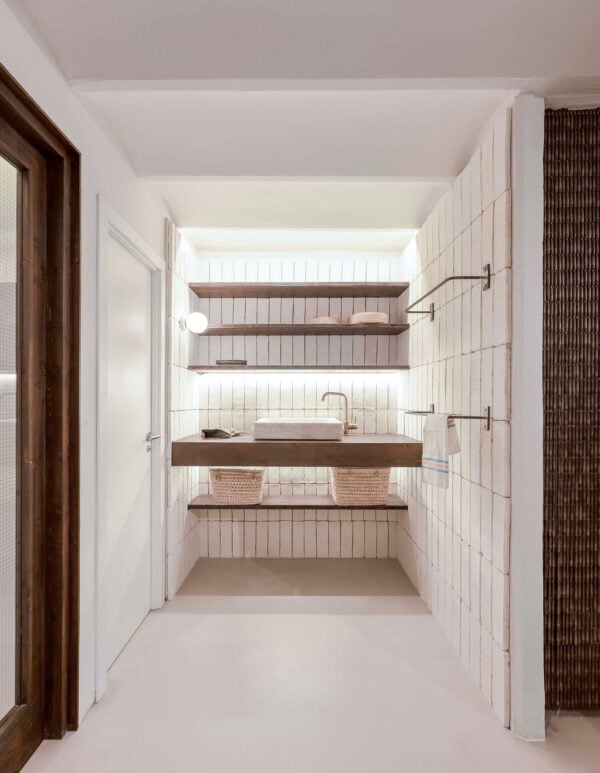 Al atravesar la fachada interior compuesta por dos arcos paralelos, los visitantes descubren una zona de exposición más privada, donde se encuentra una bancada de limpieza y una escalera que conduce a la segunda planta. Este diseño cuidadosamente pensado permite una distribución eficiente y funcional del espacio, asegurando que cada área cumpla su propósito mientras mantiene una armonía visual.