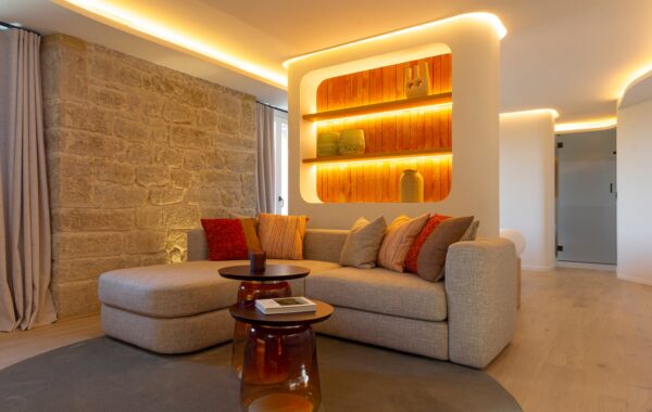 En la acertada reforma de sus apartamentos, apenas se encuentran ángulos rectos. Todas las esquinas, tanto de las paredes como de los muebles, están redondeadas, recordando quizá a las formas suaves de las botellas y al flujo del líquido granate que trae aquí a los visitantes. Este recordatorio no está solo en las formas: como hemos dicho también se encuentra en el color y en la elección de los materiales. Y aquí es donde sacamos a colación nuestros ladrillos rectangulares de barro rojo 40×10. El estudio los ha colocado en alternancia con un fondo de fibras que recuerdan al cañizo en unos cuadros rectangulares, perimetrados por una tira de luces led escondidas alrededor que iluminan el material con luz cálida.