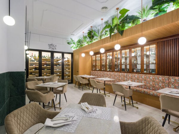 Manuela Jimena es un espacio ecléctico, único por su lazos estéticos con la capital del país. Con las inconfundibles barras de mármol, grandes y atrayentes, que recuerdan al Madrid gastronómico que cualquiera tiene en la cabeza si cierra los ojos. Su suelo de barro en tonalidades rojiza y blanco antiguo. Una estampa del ayer, ajustado a los ojos de hoy y de la que se desprende, a través de ese eclecticismo, la contemporaneidad que busca este establecimiento.