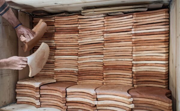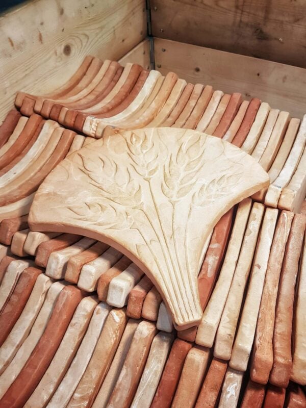 Hemos producido un total de 915 losas de 30 cm para cubrir todo el suelo del stand. Se han llevado a cabo a partir de un proceso artesanal apoyado por tecnología puntera que permite la sofisticación de los trabajos cerámicos. La composición del barro utilizado está formada por la combinación de 7 pastas cerámicas en diferentes proporciones, con lo que conseguimos una destonificación tanto en el suelo como dentro de la propia losa. Para darle aún más riqueza a la textura y evitar repeticiones en el ritmo del patrón, hemos utilizado varios moldes con pequeñas variaciones alternando el número de espigas del diseño.