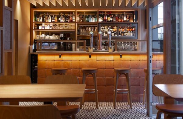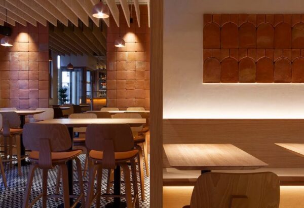 Porque si, evidentemente, como restaurante, lo más importante no deja de ser la carta y sus menús, el espacio que se ha creado para darle cobijo no se queda atrás. Y este es otro de los puntos fuertes de la propuesta de Teike. Una apuesta por un lugar, sobre todo, acogedor, donde priman los tonos cálidos y los materiales naturales, como la cerámica o la madera. En concreto, uno de esos lugares destacados donde se ve claramente esta forma de entender su arquitectura está en las zonas de la barra y las paredes. Tanto la primera como una de las segundas, están revestidas con losetas del Cuadrado 20 rojizo de todobarro, así como otras de la colección Vélez Bovedilla en tonalidad rojiza, que cuelgan como un ‘cuadro’ en la pared destacada.