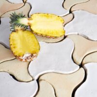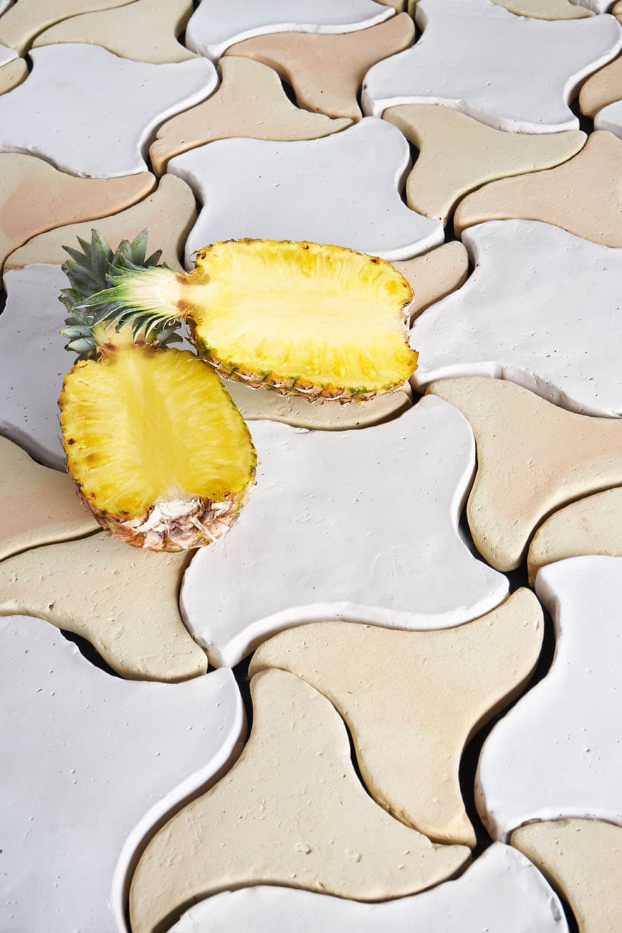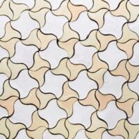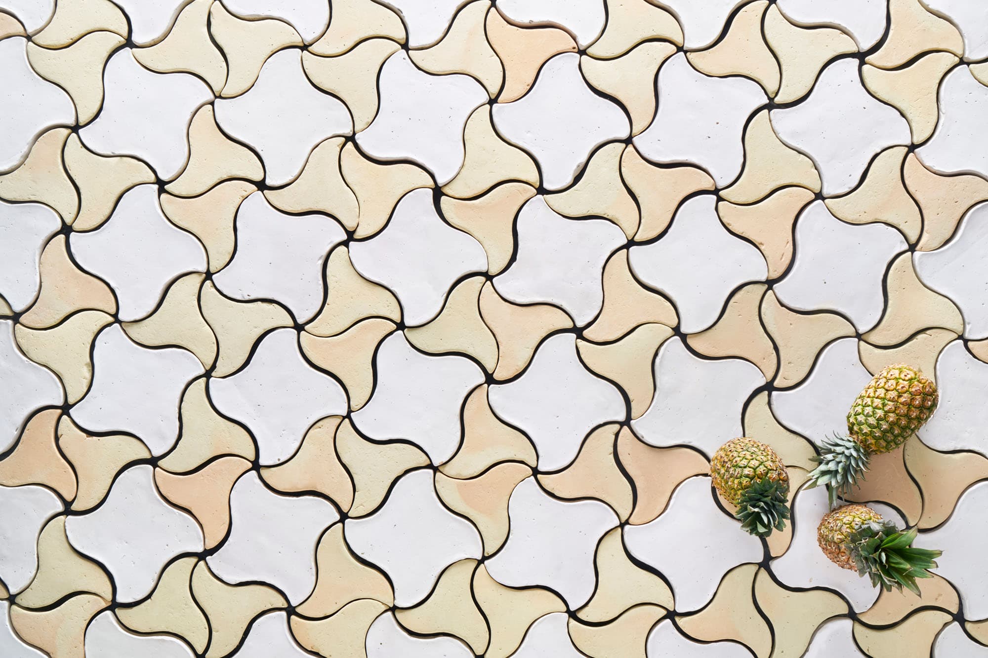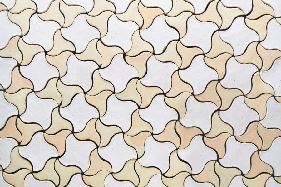 Esta hipnótica teselación surge de la combinación del formato Hélice 20 de cuatro puntas y el Hélice 20 de tres puntas. La tonalidad paja flameada, con matices anaranjados y rosáceos sobre una base clara en amarillo, resalta al contrastar con las baldosas en tonalidad blanca creando, en conjunto, un suelo de barro totalmente personal que transmite tranquilidad y calidez.